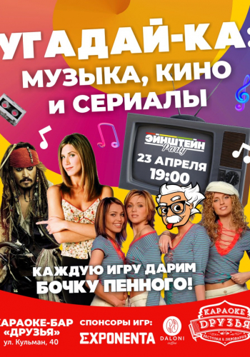 Вас ждёт вечер, полный любимых треков, хороших фильмов и популярных сериалов, которые мы будем угадывать по первым нотам, стоп-кадрам, диалогам и многому другому!
