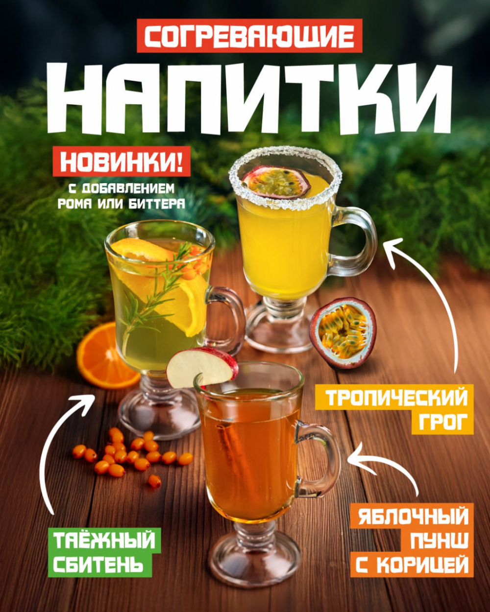 - Таёжный сбитень (биттер Becherovka, пюре из ягод морошки с мёдом и имбирём, апельсин, облепиха)