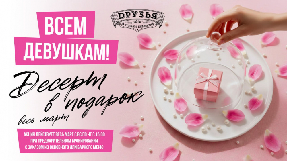 Весь месяц при предварительном бронировании стола с воскресенья по четверг (после 16:00) каждая девушка получает в подарок нежный десерт